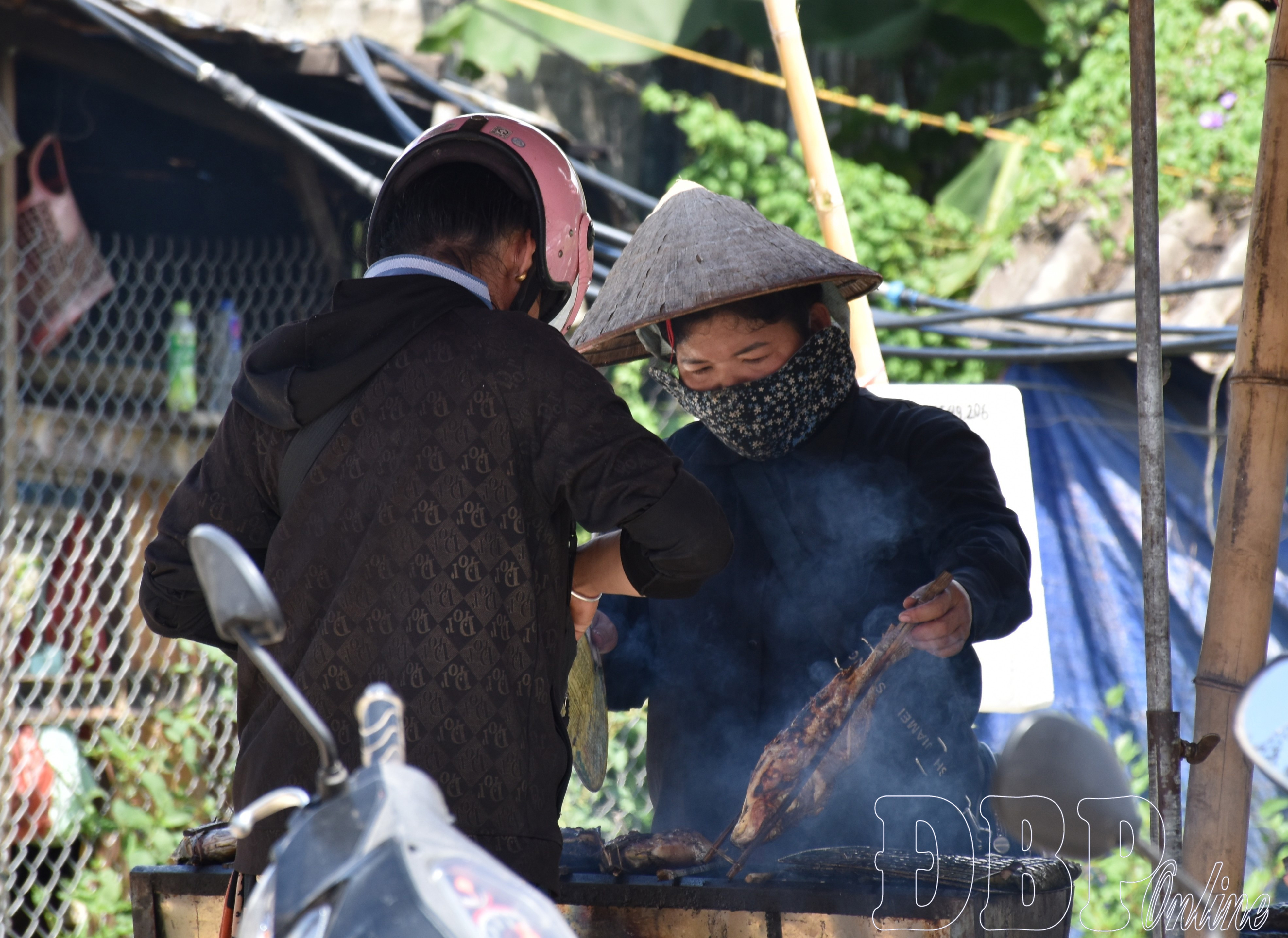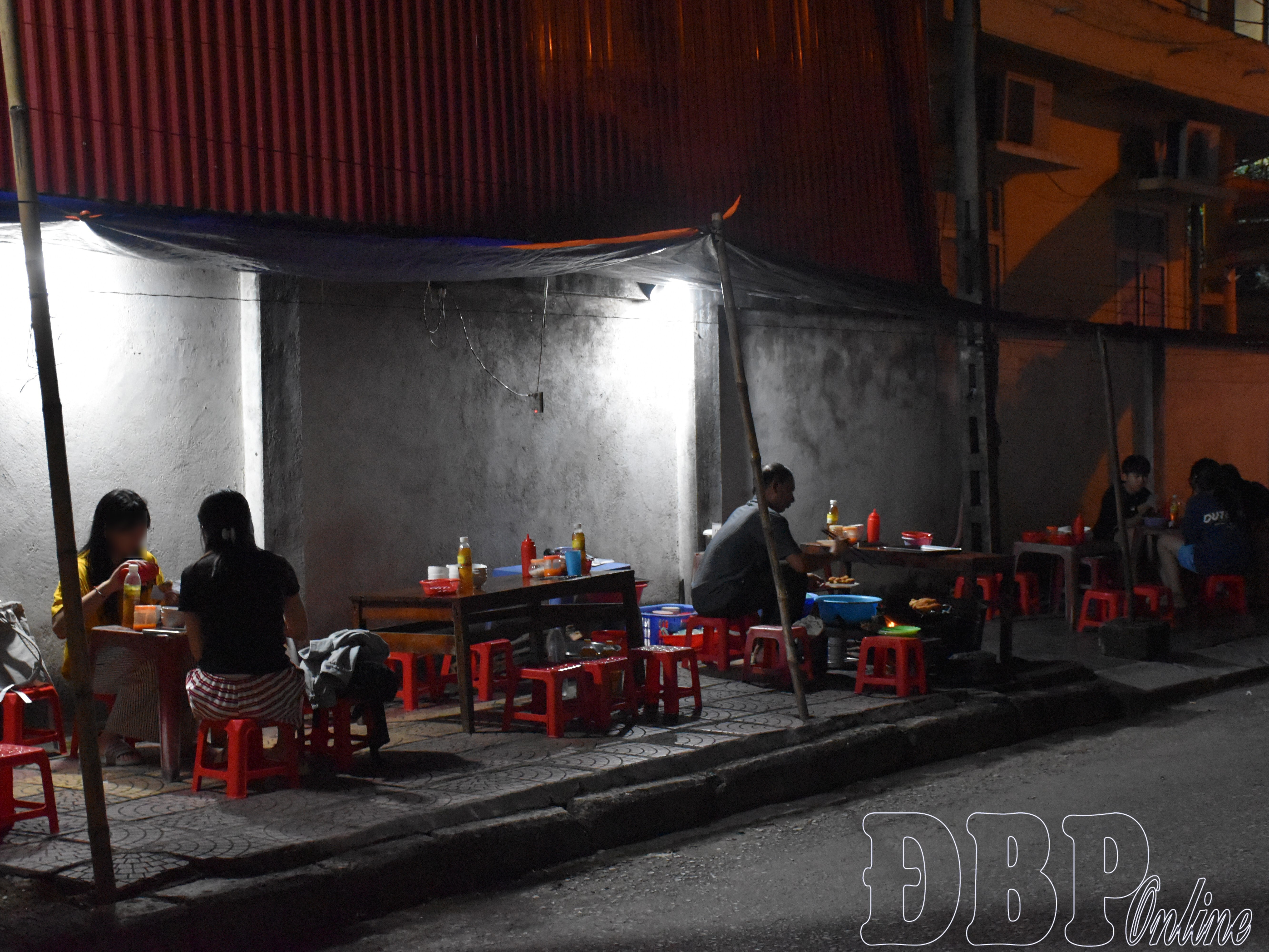 Như thường lệ, khoảng 19 giờ hàng ngày, một quầy hàng nhỏ được dựng lên ngay trên vỉa hè đường Nguyễn Chí Thanh, phường Điện Biên Phủ. Xúc xích, viên chiên, bánh rán, khoai lang kén… được bày kín chiếc bàn nhựa. Bên cạnh là chảo dầu đang sôi được người bán đặt sát mép đường. Khói, mùi dầu mỡ, bụi đường quyện vào nhau theo gió bay cũng theo vào khay thực phẩm chưa kịp che đậy.