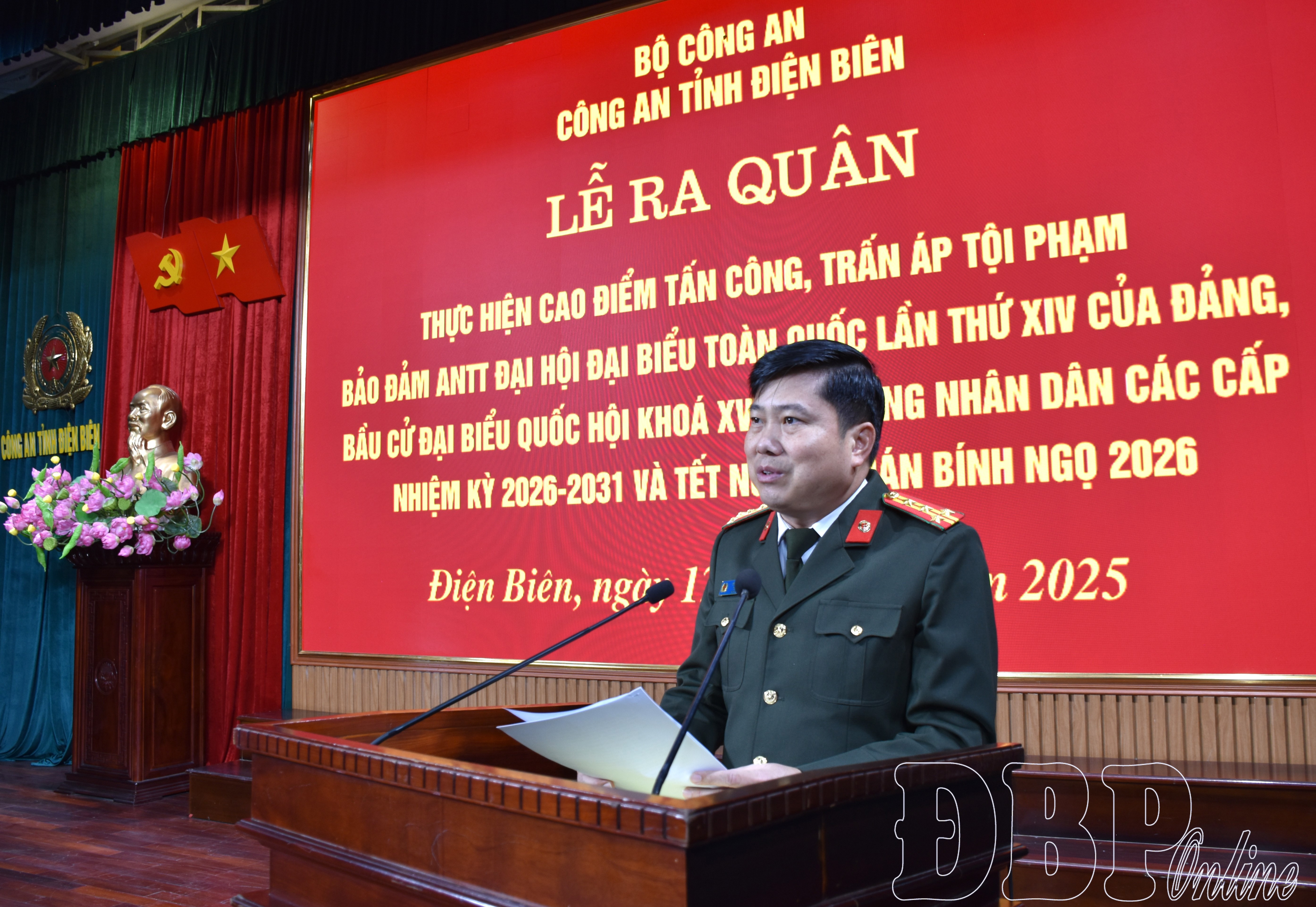 Đại tá Vũ Văn Đấu, Bí thư Đảng ủy, Giám đốc Công an tỉnh phát biểu tại lễ ra quân yêu cầu toàn lực lượng triển khai quyết liệt, đồng bộ các biện pháp nghiệp vụ; tập trung nhận diện sớm các tuyến, lĩnh vực, đối tượng phức tạp để chủ động phương án đấu tranh hiệu quả.