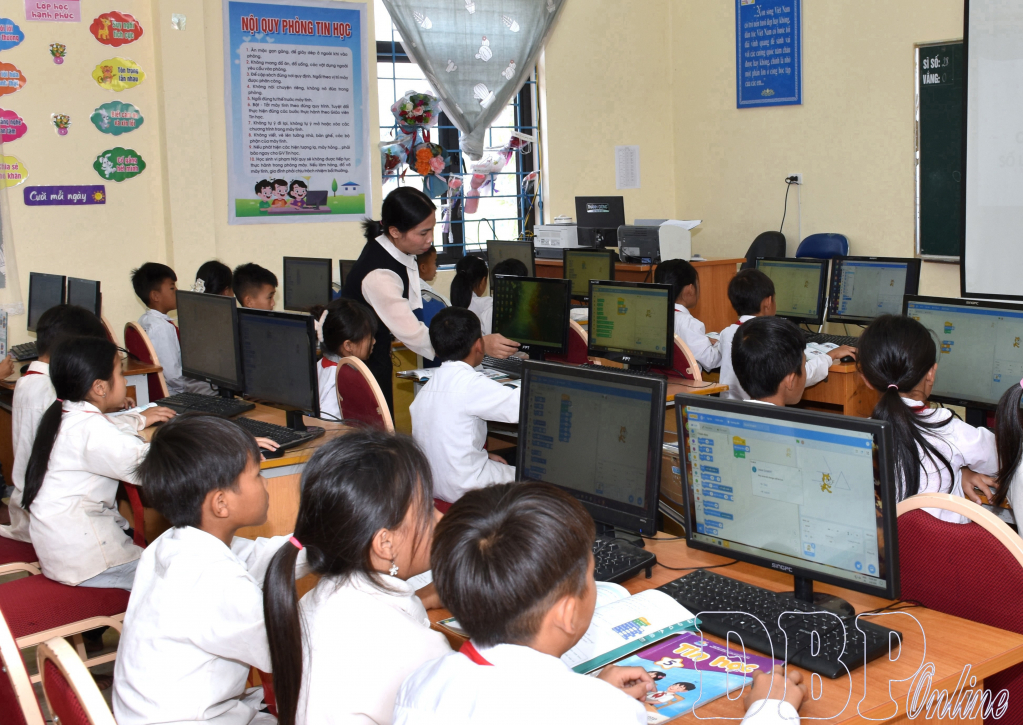 Sáng thứ 6 hàng tuần, tiết học Tin học của lớp 5A, Trường Phổ thông Dân tộc bán trú (PTDTBT) Tiểu học Trần Văn Thọ, xã Mường Nhé bắt đầu bằng tiếng “tách… tách…” của bàn phím máy tính vang lên trong căn phòng nhỏ. Trên màn hình máy chiếu, bài giảng điện tử hiện ra với hình ảnh sinh động về cách tìm kiếm thông tin trên internet. Tiếng học sinh trao đổi bài sôi nổi, hướng dẫn nhau cách thao tác. Thi thoảng vang lên những tiếng gọi: “Cô ơi, em làm được rồi!”, “Bấm vào đây này!” Không khí lớp học vì thế trở nên rộn ràng, hào hứng, khác hẳn với những giờ học trước đây khi học sinh chỉ quen với bảng phấn và sách giáo khoa.