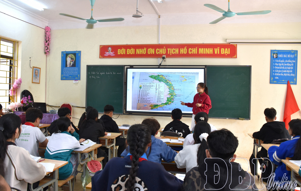 Ở Trường Phổ thông Dân tộc bán trú THCS Mường Nhé, một tiết học môn Địa lý của lớp 9D3 diễn ra sôi nổi. Bản đồ Việt Nam được trình chiếu rõ nét với các ký hiệu về địa hình, tài nguyên và các vùng lãnh thổ. Cô giáo đứng cạnh bảng, vừa chỉ vào từng khu vực trên bản đồ, đồng thời đặt câu hỏi gợi mở cho học sinh. Nhiều cánh tay đồng loạt giơ lên xin phát biểu, các nhóm học sinh khác cũng nhanh chóng trao đổi để tìm câu trả lời.