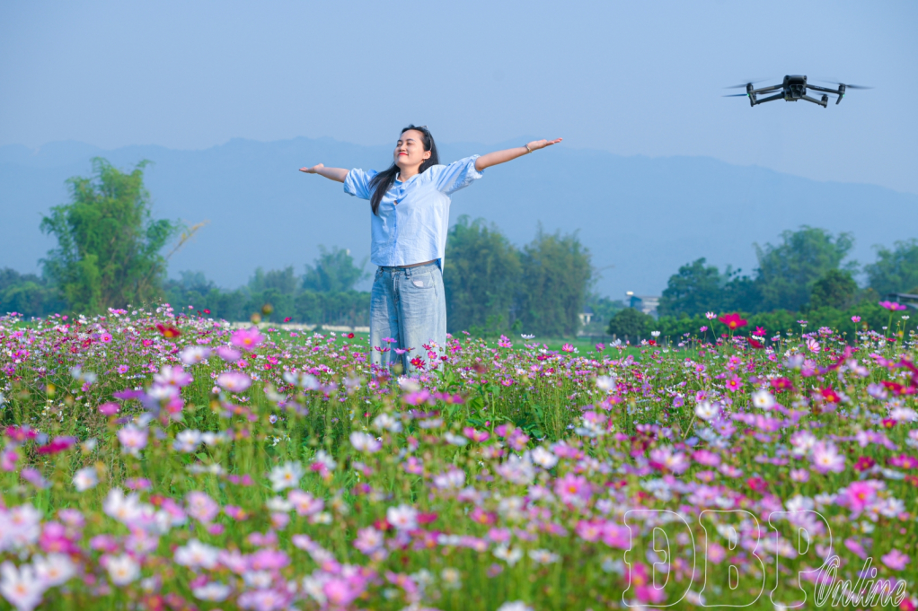 Amidst the open space of the fields near team 19, a cosmos flower road stands out like a soft silk ribbon draped across a lush green rice carpet. The small, winding dirt path follows the contours of the field edges, with both sides blanketed in shimmering clusters of blossoms that draw in both locals and photography enthusiasts looking to capture a serene moment.