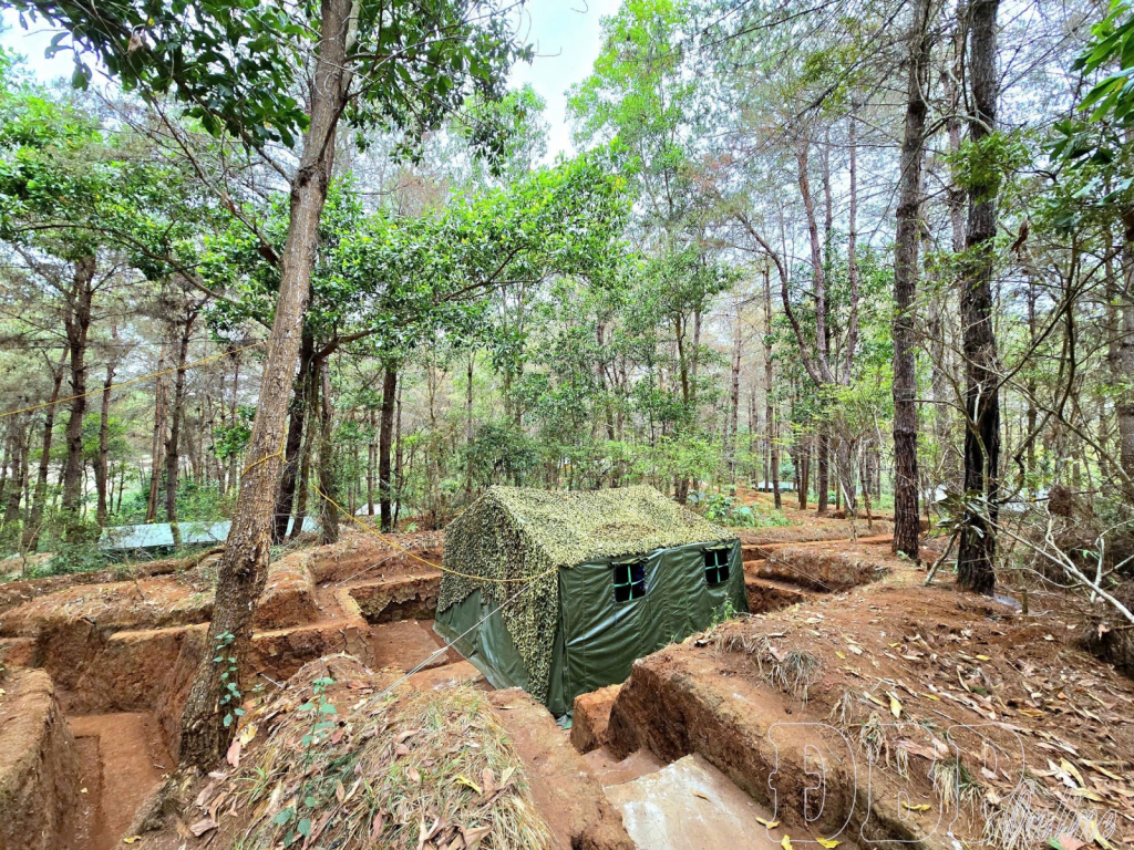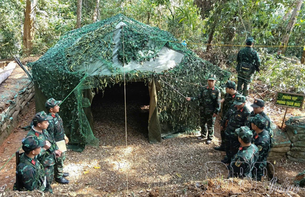 Senior Colonel Nguyễn Văn Hoạt, Deputy Commander and Chief of the Staff of the provincial Military Command, directly issued the marching orders. A whistle sounded, and the military convoy took turns leaving the barracks. After traveling through mountainous roads, the troops arrived at a simulated combat base deep under the forest canopy. A field “command post” was ready, and the communication system was activated seamlessly.