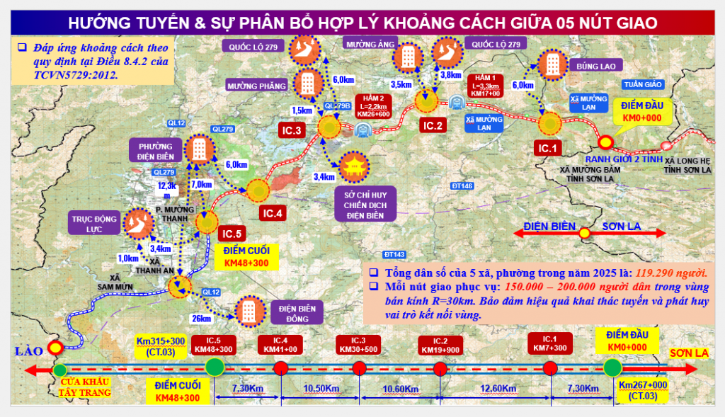 The arrangement of interchanges has also been meticulously calculated to ensure the highest operational efficiency and inter-regional connectivity. Strategic locations in Mường Phăng, Mường Ảng, and Búng Lao were selected based on their roles as economic and tourism hubs. For instance, an interchange at Mường Phăng is essential to provide direct access for tourists to the historical relic site without requiring them to travel down to Điện Biên Phủ ward and back up. Meanwhile, as Mường Ảng is oriented to become an industrial development zone, a dedicated interchange there is necessary to facilitate logistical needs and industrial growth.
