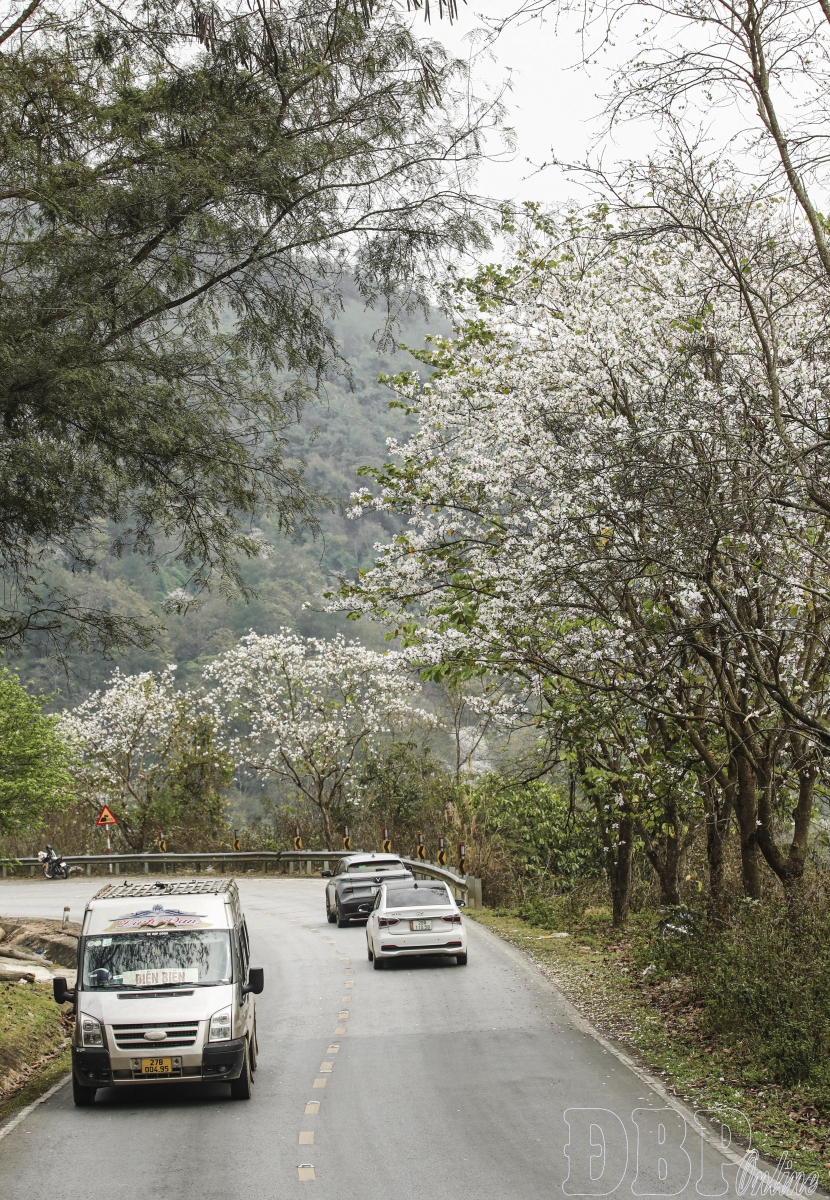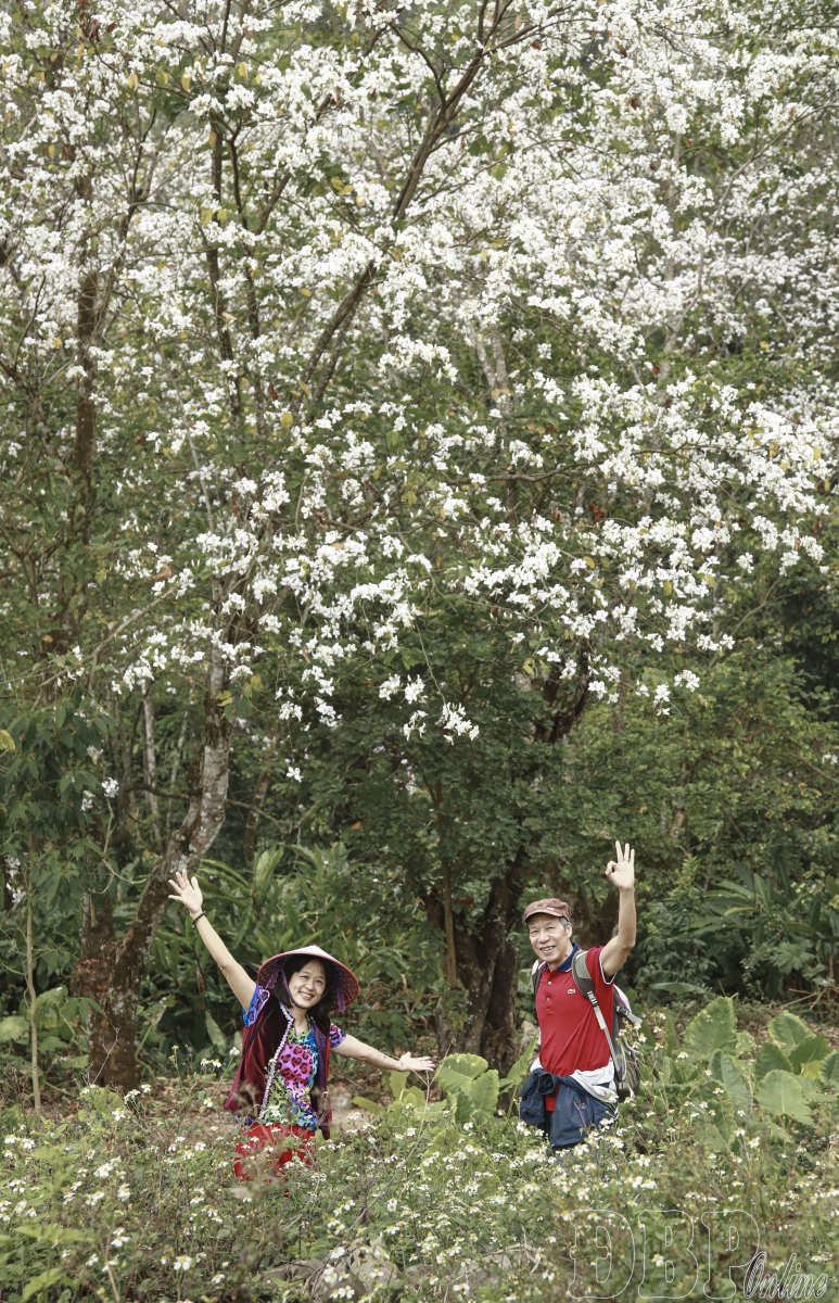 The journey to discover the “homeland of bauhinia flowers” often starts as travelers reach the summit of Pha Đin Pass in Quài Tở commune along National Highway 279. Throughout March, along the winding mountain passes, white flowers line both sides of the road, mingling with the lush green of macadamia and coffee plantations and the thriving forest trees. The sight of petals drifting gently onto the road adds a lyrical and unforgettable touch to the adventure.