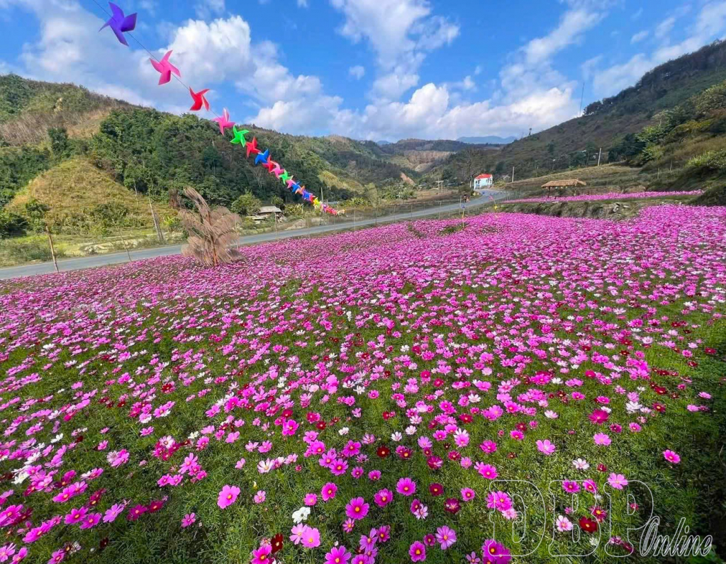 In Village 36, Na Sang commune, a cosmos flower garden spanning thousands of square meters bloomed brilliantly during the recent Lunar New Year, becoming a “hot” destination for nature lovers and photographers. Located right next to National Highway 12, the site welcomes hundreds of visitors each day, including many from neighboring provinces.