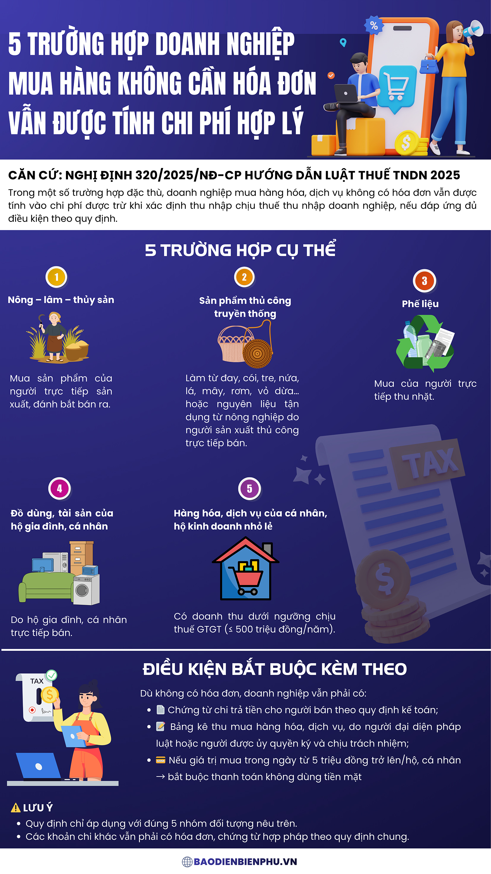 ĐBP - Chính phủ ban hành Nghị định số 320/2025/NĐ-CP hướng dẫn Luật Thuế thu nhập doanh nghiệp năm 2025, trong đó quy định rõ 5 trường hợp doanh nghiệp mua hàng hóa, dịch vụ không cần hóa đơn vẫn được tính vào chi phí được trừ. Các trường hợp được quy định cụ thể, kèm điều kiện về chứng từ và thanh toán không dùng tiền mặt, giúp doanh nghiệp, hộ kinh doanh và bạn đọc nắm chắc quy định, áp dụng thống nhất, hạn chế rủi ro khi quyết toán thuế.