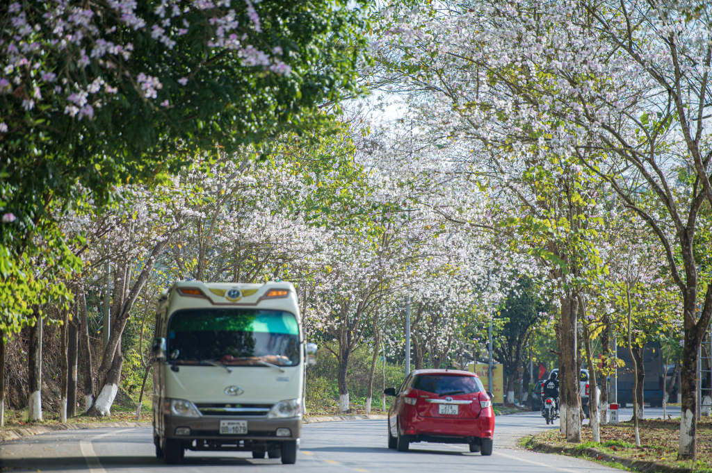 Từ những tuyến đường hướng về trung tâm phường Điện Biên Phủ đến tận khu vực Cửa khẩu Tây Trang (xã Sam Mứn), những hàng ban nối dài thành dải lụa trắng uốn lượn.