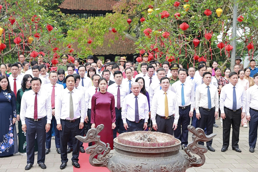 Đúng 7 giờ sáng, đoàn hành lễ xuất phát, trang nghiêm tiến qua cầu dẫn vào sân Đền thờ Quốc Tổ Lạc Long Quân. Sau khi ổn định đội hình, nghi thức dâng hương chính thức được cử hành theo nghi lễ truyền thống.