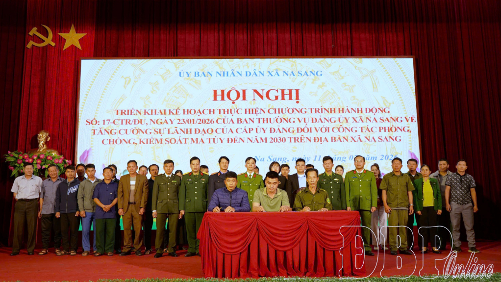 ĐBP - Tại hội nghị triển khai Kế hoạch thực hiện Chương trình hành động của Ban Thường vụ Đảng ủy xã về tăng cường sự lãnh đạo của cấp ủy Đảng đối với công tác phòng, chống, kiểm soát ma túy tổ chức chiều ngày 11/2, xã Na Sang phấn đấu đến hết năm 2026, 100% bản, tổ dân phố trên địa bàn không ma túy.